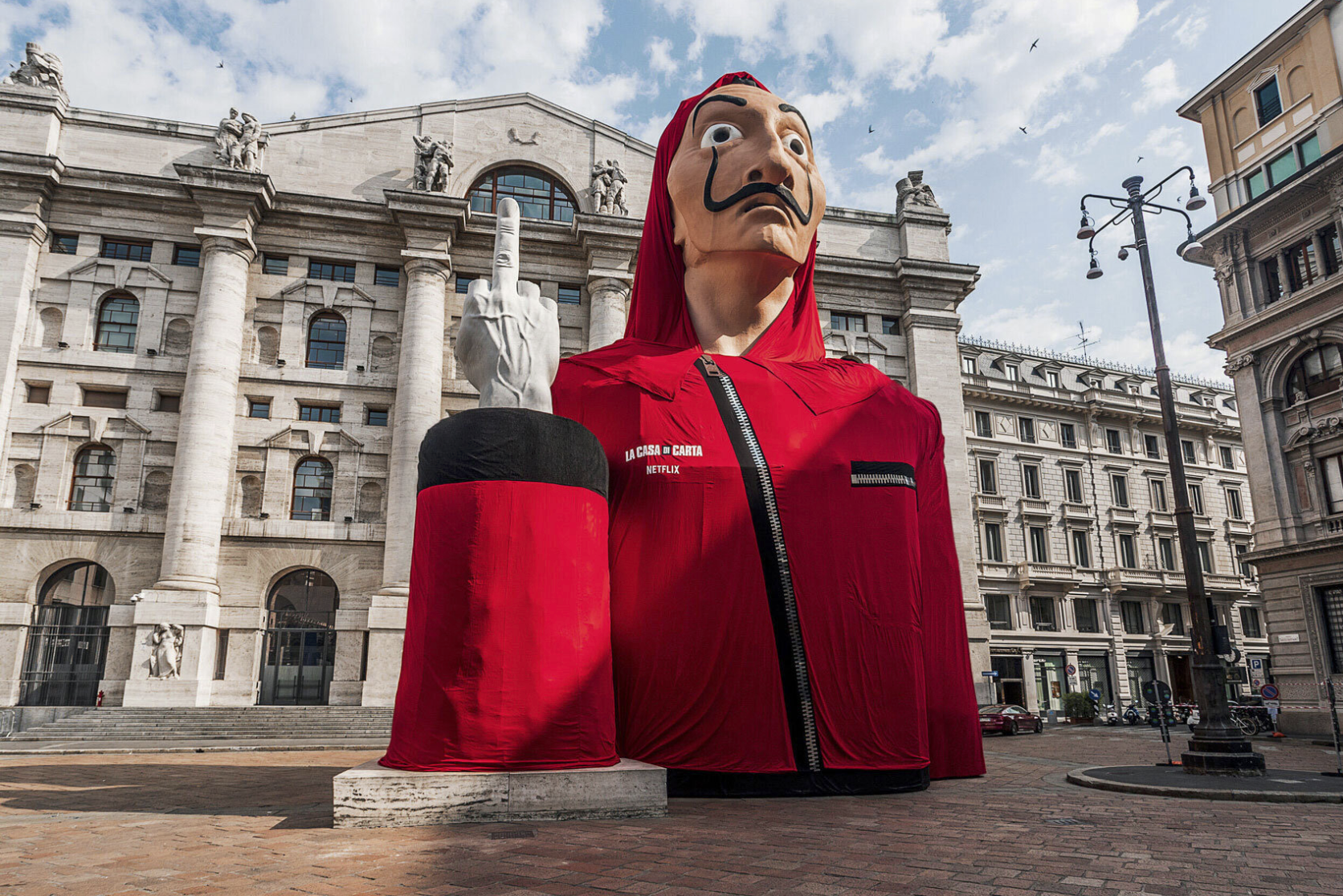 That’s how Plaza de Papel was born: an ambient that turns Maurizio Cattelan’s iconic anti-establishment monument into a reflection of the protagonists’ actions, holding the Italian stock exchange hostage of La Resistencia.